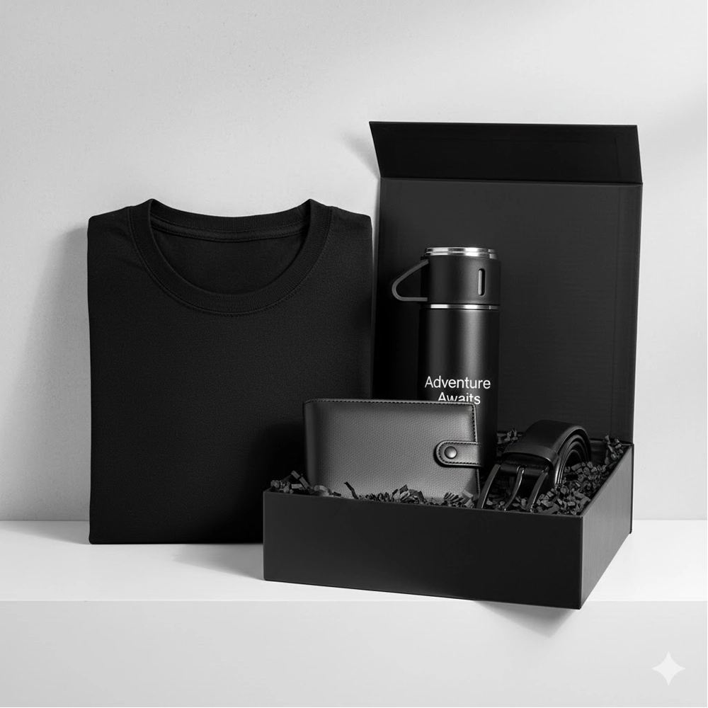 Upgrade your gifting experience with our exclusive Men’s Premium Black Combo Set, designed for men who appreciate style, simplicity, and functionality. This elegant all-black collection includes a premium cotton t-shirt, a high-quality leather wallet, a durable classic belt, and a personalized stainless-steel bottle with “Adventure Awaits” printed for a bold, motivational look.